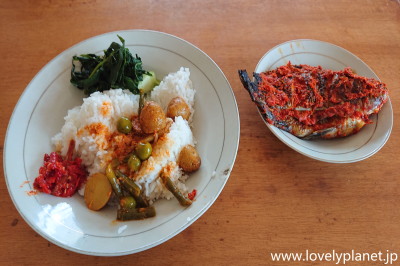 《インドネシアの食事 ③》 因みに、通常のインドネシアの食堂での食事はこんな感じです。 白米にちょっと辛みの効いたソースをかけて付け合わせの野菜などを添えたものに、一品か二品のメインディッシュを選びます。 この日は魚のスパイス煮込みでした。これで200円程度です。 |