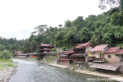 《ブキッ・ラワン ⑧》 吊り橋から見た先ほどの通路沿いの町並みです。何だか日本の寂れた小さな温泉街のような風情です。 ただし、こんな小さな村ですが、ここは世界遺産(自然遺産)に登録されたスマトラオランウータンの最大の動物保護区であるグヌンルスル国立公園(Taman Nasional Gunung Leuser)への観光拠点であることからツーリスト(特に欧米からのバックパッカー)が多く訪れるため、川の両側には多くの民宿やロッジが点在しています。 |