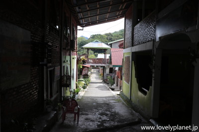 《ブキッ・ラワン ③》 とはいうものの、ブキッ・ラワンのロケーションは丘とは程遠く、バホロク川(Sungai Bahorok)という小さな川沿いに位置しています。 1枚目の写真がメダンに続くメインストリートで、中心部にはそれに平行して左の写真のようなバイクまでしか通行できないような道がある程度の小さな村です。 |