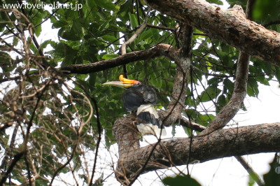 《ジャングル・トレッキング ③》【世界遺産】 こちらはサイチョウという鳥です。名前は、頭部にある鶏冠が動物のサイの角のように見えることに由来しているそうです。 なお、この大きな突起(カスク)は重そうに見えますが、内部はスポンジ状になっているため非常に軽いそうです。 |