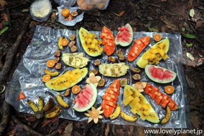 《ジャングル・トレッキング ⑥》 昼食は、ナシゴレンの弁当とフルーツです。 フルーツは盛り付けも凝っていてホスピタリティに溢れる感じで、とても美味しく頂くことができました。 |