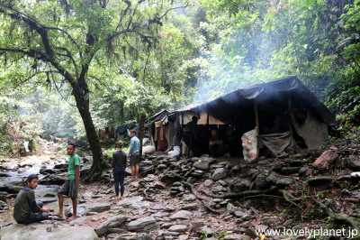 《ジャングル・トレッキング ⑪》 竹や木材の骨組みに防水シートを被せた簡素な構造の大型テント小屋が川沿いに5棟くらい並んでいるだけです。 因みにトイレの類いはありません。男女ともに物陰(気に入った場所)に隠れて用を足すというスタイルです。 夕食は河原でバーベキューを楽しみました。 |