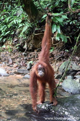 《ジャングル・トレッキング ⑰》【世界遺産】 因みに、オランウータンというのはインドネシア語で「森の人」という意味で、現生種はボルネオ島とスマトラ島の一部にのみ分布している上、類人猿の中で最も樹上性の傾向が強く、ほとんどの時間を樹上で過ごすということから、このように地上で間近で見られるというのは非常に稀なことのようです。 とてもラッキーなひとときでした。 |